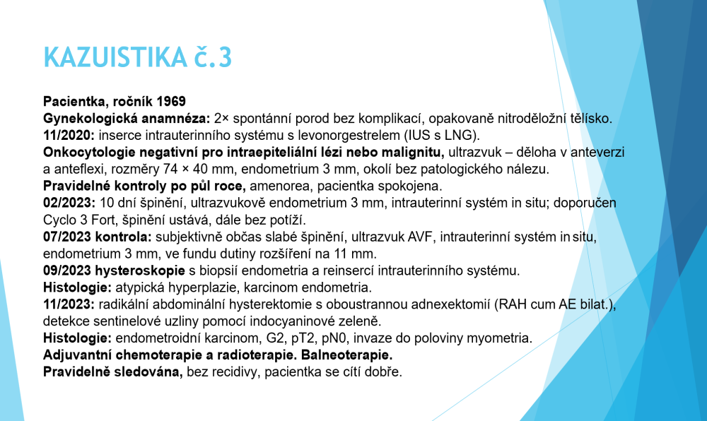 Poslední kazuistika pojednávala o rozvoji karcinomu endometria u pacientky s tříletým užíváním IUS s LNG. Tělísko bylo zavedeno při ultrazvukovém nálezu nízké výšky endometria, a i při pravidelných kontrolách byl ultrazvukový nález až do počátku spottingu vždy bez patologie.
