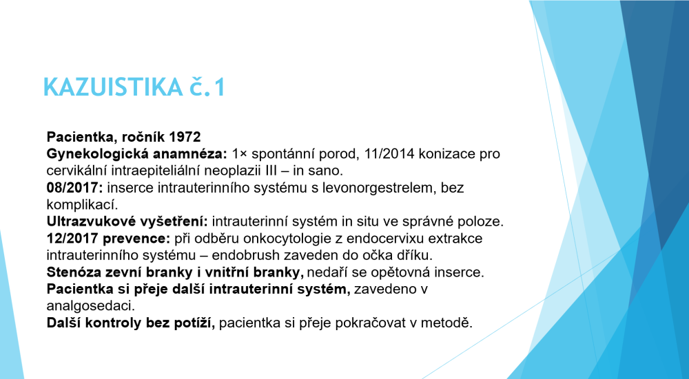 První kazuistika dokumentovala případy nechtěné extrakce IUD při odběru cytologie a těsně po inserci při nesprávné manipulaci s nástroji.
