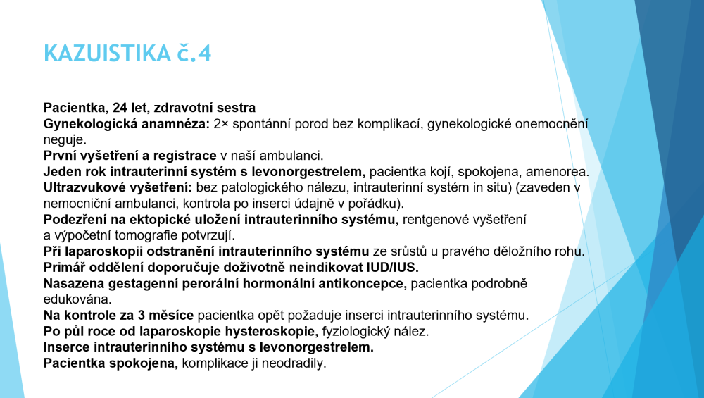 Třetí kazuistika popsala případ ektopicky uloženého IUS v dutině břišní po dvou letech užívání metody, následnou diagnostiku uložení, laparoskopické odstranění a opětovné zavedení IUS na přání pacientky po hysteroskopické kontrole zhojení děložní stěny.