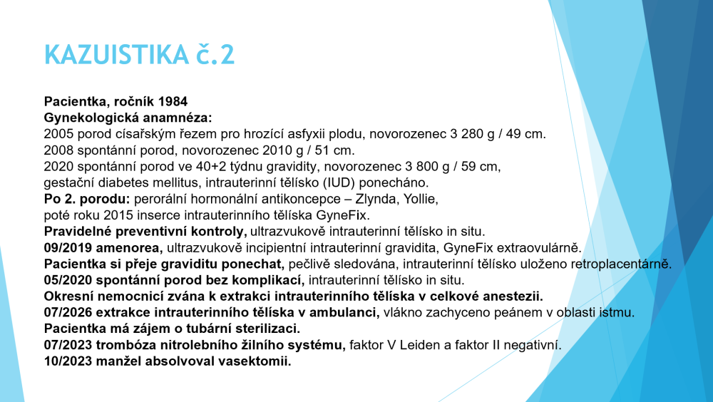 Druhá kazuistika uváděla případ donošené gravidity při IUD GyneFix ponechaném in situ.